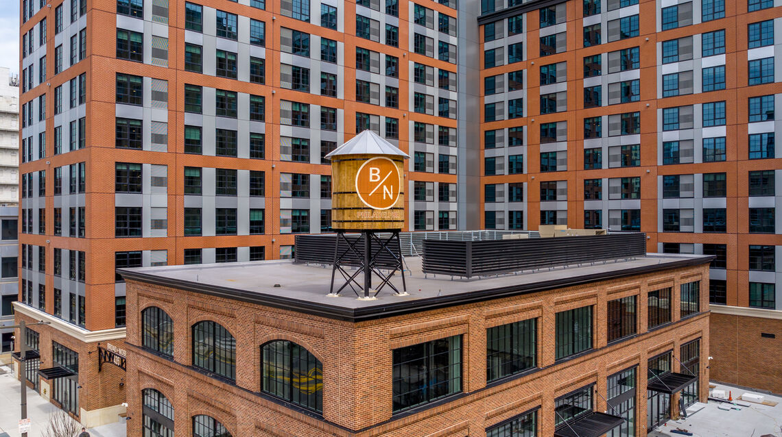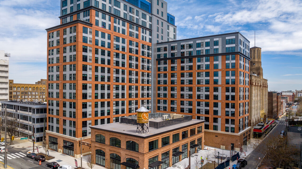 Broad + Noble is a 231-foot-tall, 19-story, L-shaped, residential high-rise with 10,440 SF of retail space. It features 344 residential units, underground parking, a beautiful lobby/common area, outdoor plaza, fitness center, and an incredible “sky-lounge” amenity space with an outdoor terrace. The facade incorporates a grid of red brick with light and dark gray metal panels. The northern wing stands taller than the eastern wing with a 2-story podium brick-clad structure at the southwest corner designed to look like a separate building. The modern industrial aesthetic draws inspiration from the Callowhill neighborhood and nearby Rail Park.