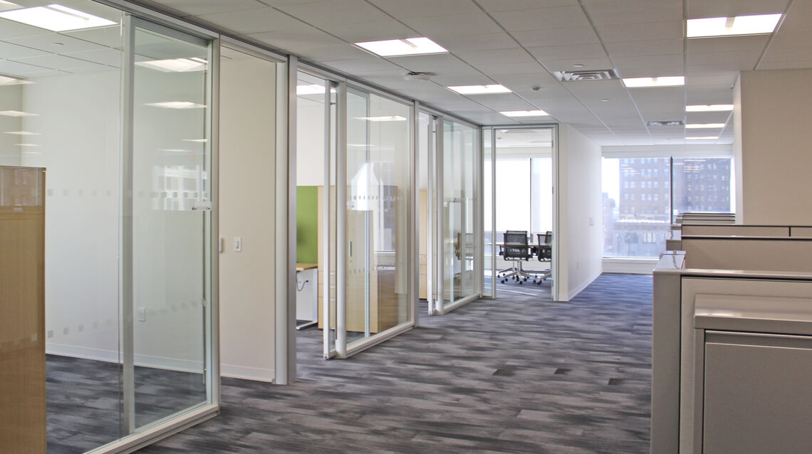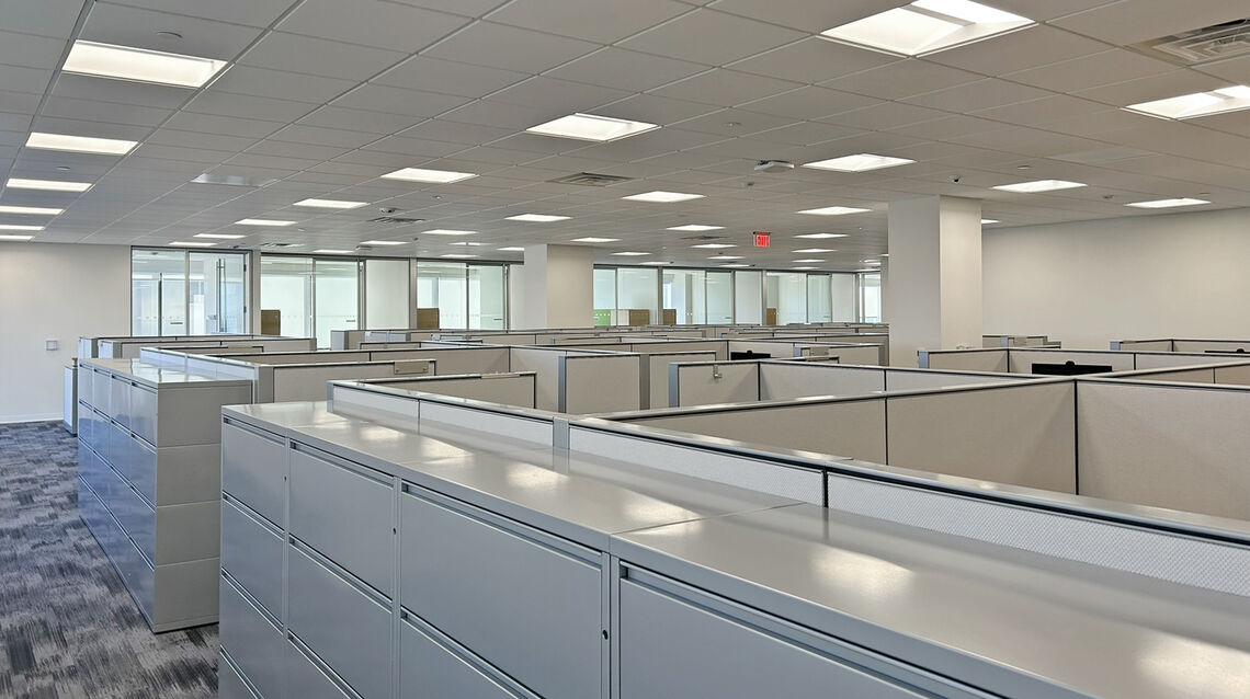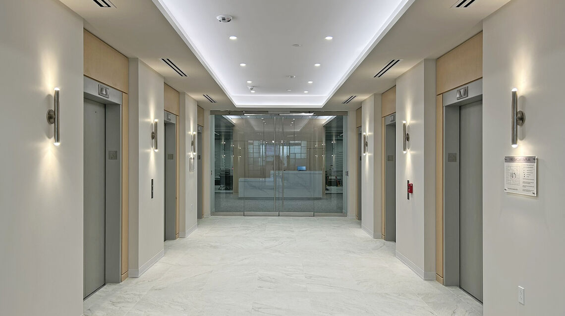 The renovated space features a welcoming elevator lobby and reception lounge anchored by a marble reception desk and custom millwork, along with a large communal café highlighted by a custom coffered ceiling and integrated lighting. Additional program elements include an auxiliary kitchenette, five conference rooms, two huddle rooms, three privacy rooms, 19 private offices, 58 open office workstations, a 1,500 SF assembly space, and both public and private restrooms. Clemens coordinated closely with the client, design team, and building management to deliver a high-quality, contemporary office environment within an active office tower, prioritizing quality, schedule, and seamless execution.