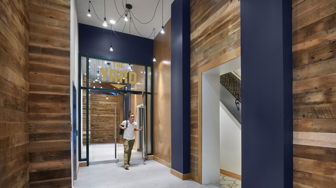 This contemporary communal work space with an open, upscale feel was achieved by complementing the exposed brick and ceilings with the extensive use of floor-to-ceiling glass walls and sliding barn doors for each office and meeting room, alongside traditional walls painted bright magenta, yellow, and blue. Bright track and pendant lighting was installed throughout the space. The newly restored capitals were also highlighted with uplighting. The project was completed with the construction of a private roofdeck.